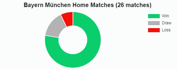 সাম্প্রতিক সর্বশেষ ১২ মাসে বায়ার্ন মিউনিখ মোট ৫৯ টি ম্যাচ খেলেছে। তার মধ্যে তাদের ৩৯ টি জয় আছে; ১৩ টি ড্র আছে; এবং ৭ টি ম্যাচ লস। অন্য কথায়, বায়ার্ন মিউনিখ ৬৬% জিতেছে, ২২% ড্র করেছে এবং তাদের সাম্প্রতিক ম্যাচগুলির মধ্যে ১১% হেরেছে।