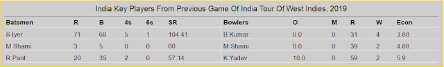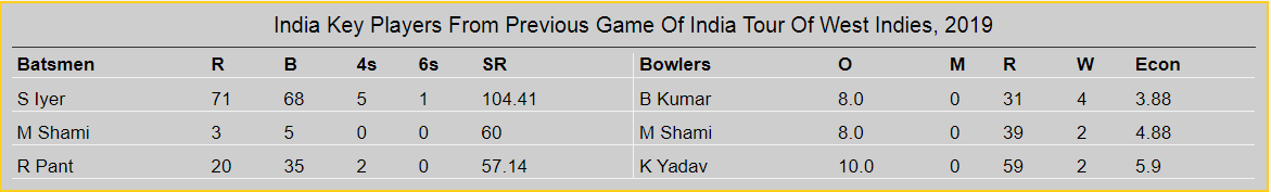 ইন্ডিয়ার, ওয়েস্ট ইন্ডিজের বিপক্ষে ওয়ানডে সিরিজটি ক্যারিবিয়ায় জয়ের এক দুর্দান্ত সুযোগ হবে। আগের খেলায় ব্যাট হাতে ভারতীয় দলের অধিনায়ক বিরাট কোহলি নেতৃত্ব দিয়েছিলেন এবং ডাকওয়ার্থ লুইস পদ্ধতিতে ভারতকে ৫৯ রানের জয় এনে দিতে সহায়তা করেছিলেন। ব্যাটিং বিভাগে, শিখর ধাওয়ান, রোহিত শর্মা এবং বিরাট কোহলির মতো ব্যাটসম্যান্দের স্কোরের সব নির্ভর করবে। আগের খেলায় ধাওয়ান ও শর্মার উদ্বোধনী জুটি এতোটা শক্ত ছিল না। এই সিরিজের ফাইনালে টিম ম্যানেজমেন্ট আশা করবে যে উদ্বোধনী জুটি ব্যাট হাতে বড় রান দিতে পারে এবং ওয়েস্ট ইন্ডিজের বিপক্ষে উড়ন্ত সূচনায় নামতে পারে।