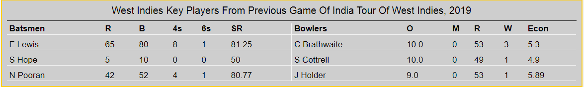 এই ২৭ বছর বয়সী এই খেলোয়াড় এর টেস্ট রেকর্ডটি বেশ দুর্দান্ত, তবে এখনও পর্যন্ত সাদা বলের ক্রিকেটে প্রত্যাশা পূরণ করতে ব্যর্থ হন। আগের খেলায় তিনি দুর্দান্ত বোলিং করেছিলেন এবং রোহিত শর্মার বড় উইকেট তুলেছিলেন। ত্রিনিদাদে ওয়ানডে সিরিজের আগের খেলায় তিনি ২৩ বলে ১৮ রান করেছিলেন। বোলিং বিভাগে, দলটি নতুন বল নিয়ে উইকেট বাছাই করতে শেল্ডন কট্রেল, ওশান টমাস এবং জেসন হোল্ডারের উপর নির্ভর করবে। আগের খেলায় অলরাউন্ডার কার্লোস ব্র্যাথওয়েট তিন উইকেট নিয়ে স্ট্যান্ডআউট বোলার হয়েছিলেন।