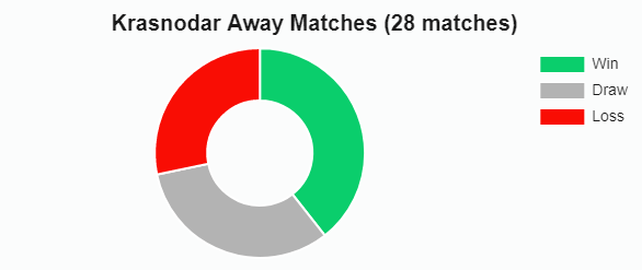 গত বছরের তুলনায় তাদের সাম্প্রতিক ফর্মে, ক্রাসনোদার মোট ৫৭ টি ম্যাচ খেলেছে। এর মধ্যে তাদের ৩০ টি জয় আছে; ১৬ টি ম্যাচ ড্র; এবং ১১ টি ম্যাচ তারা হেরে গিয়েছে। এই ফলাফলগুলি তাদের সাম্প্রতিক উইন-ড্র-লসের হার দেয়: ৫২% -২৮% -১৯%।