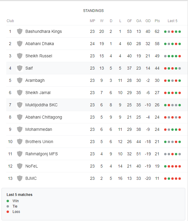 মুক্তিযোদ্ধা এস কে সি ক্লাবের গোল পার্থক্য হচ্ছে -১০ এবং তাদের লীগ পয়েন্ট হচ্ছে ২৬। তাছাড়া, সাইফ স্পোর্টিং ক্লাব তাদের শেষ ম্যাচে পরাজয় লাভ করেছে আবাহনী এর সাথে এবং অপরদিকে মুক্তিযোদ্ধা এস কে সি ক্লাব জয়লাভ করেছে মোহামেডান এর সাথে। চলুন এক নজরে দেখে নেওয়া যাক লীগ টেবিল-