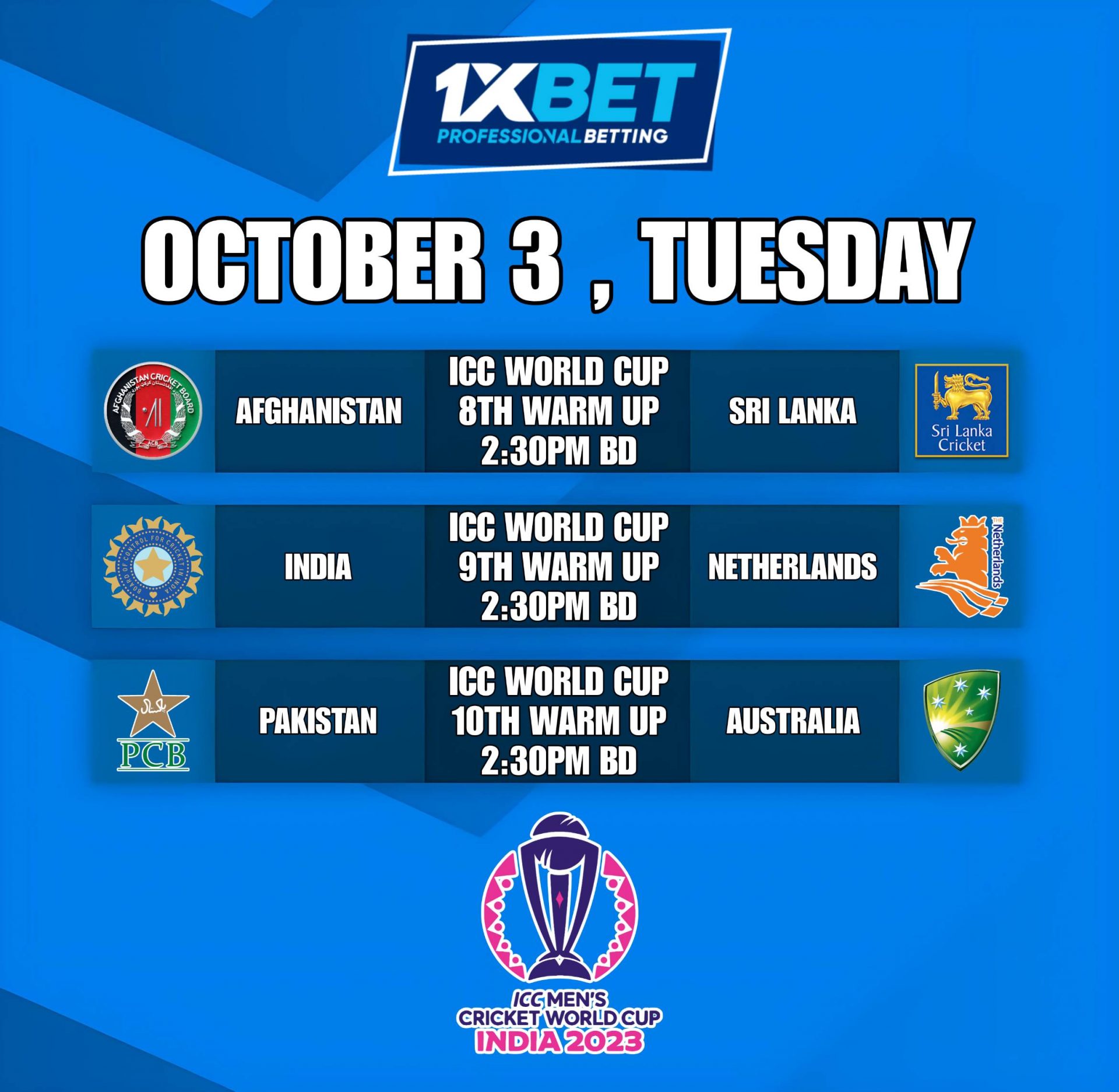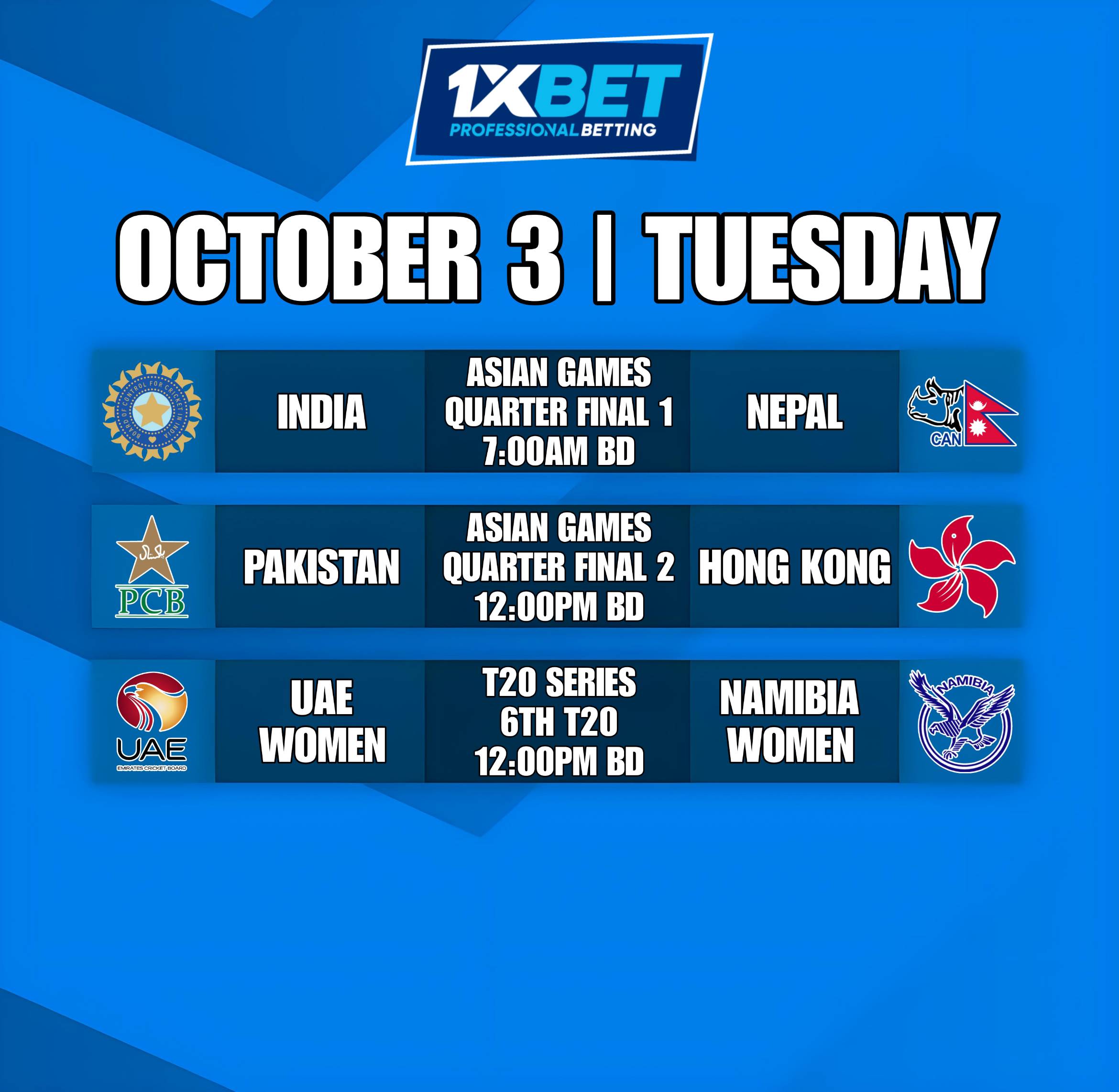 Football/cricket Match schedule and betslip: 3 October 2023