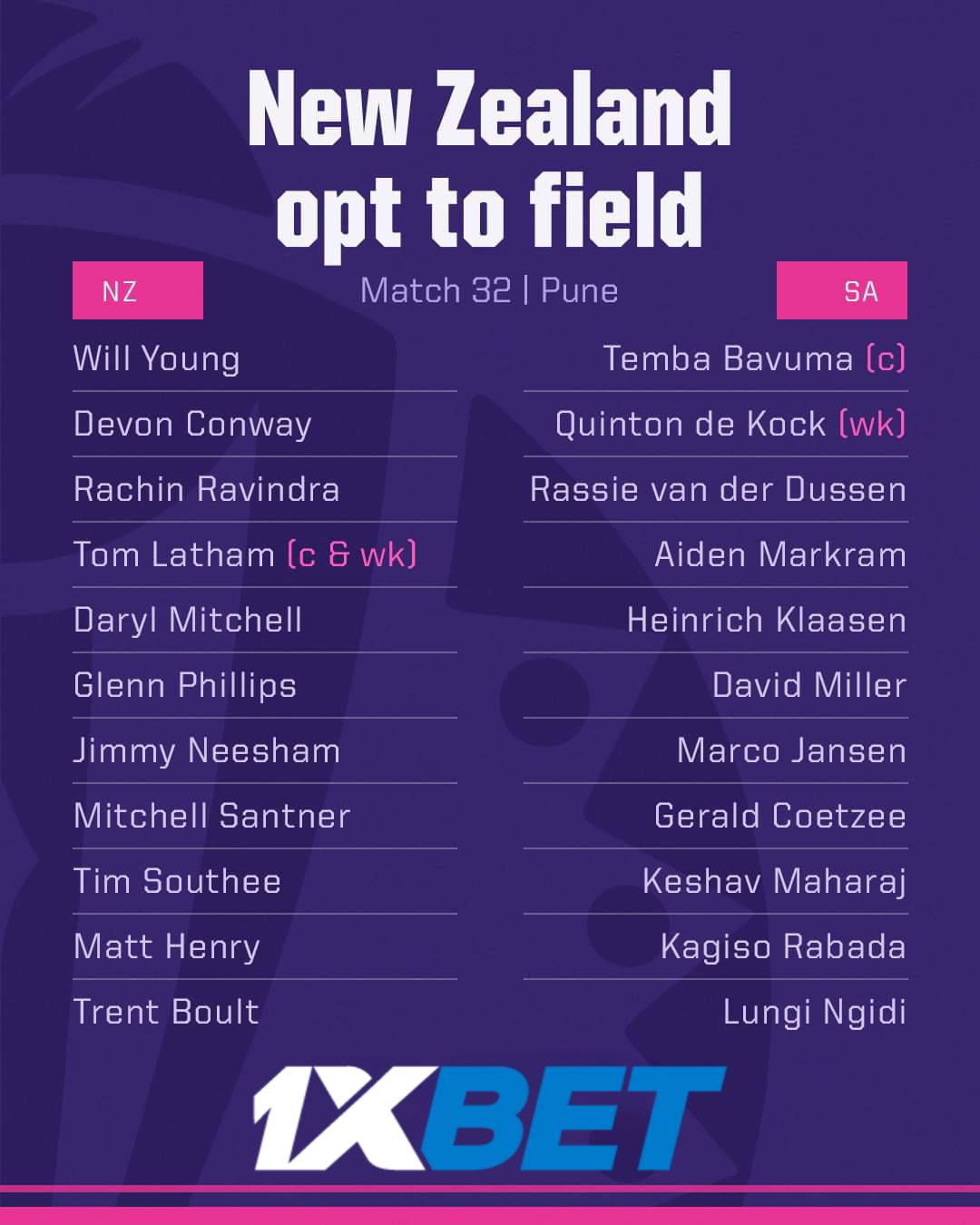 Tim Southee comes in for Lockie Ferguson; Kagiso Rabada replaces Tabraiz Shamsi.